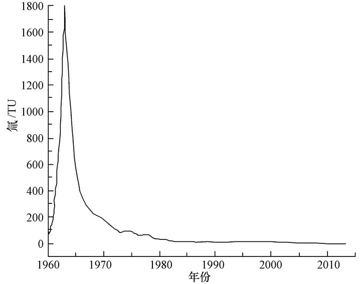 ?圖3 南京大氣降水氚濃度 1960—2010 年恢復曲線
