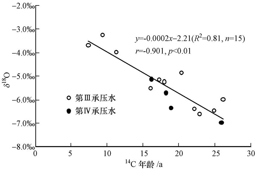 分析發(fā)現(xiàn),14C年齡與δ18O顯著負(fù)相關(guān),相關(guān)系數(shù)為-0.901(n=15,p<0.01),研究區(qū)地下水形成年齡越老,δ18O愈加偏負(fù)(圖 4),這與區(qū)域第四紀(jì)氣候演變有著密切的關(guān)系.距今13000~60000 a 的玉木冰期,δ18O 值比現(xiàn)在平均低約10‰,我國(guó)東部沿海地區(qū)地下水樣品在全新世和晚更新世不同時(shí)期降水中δ18O 差值也大概在 2‰左右.據(jù)此可確定,研究區(qū)大部分深井地下水為末次冰期(大理冰期)的降水補(bǔ)給,只有極少部分深井為全新世早期的降水補(bǔ)給.