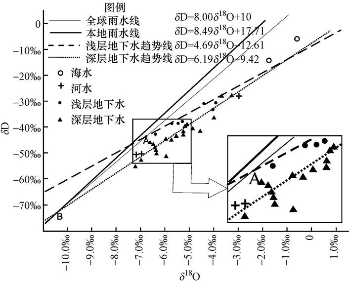 地下水趨勢(shì)線(蒸發(fā)線)與當(dāng)?shù)赜晁€的交點(diǎn)可以代表補(bǔ)給地下水時(shí)的源區(qū)降水氘氧同位素的平均組成.代表深層水補(bǔ)給源的B點(diǎn)位于淺層水補(bǔ)給源A點(diǎn)之下(圖 2),表明深層地下水接受補(bǔ)給的降水δ18O、δD 值比淺層水偏負(fù),推測(cè)深層地下水是在氣溫較低的條件下接受的降水補(bǔ)給.