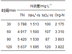 水熱液中總氮一般包括無機氮和有機氮,無機氮又包括氨氮、 亞硝酸鹽氮和硝酸鹽氮. 本研究中亞硝酸鹽氮(NO2--N)采用重氮化偶合法測定,其檢測下限是0.01 mg·L-1. 本研究水熱液中亞硝酸鹽氮濃度低于檢出值,因為具有一定還原性的NO2-不穩(wěn)定,在水熱過程中少量的NO2-氧化為NO3-. 表 3給出了不同水熱處理時間后所得水熱液中總氮、 氨氮和硝酸鹽氮的變化情況,其中有機氮的濃度是由總氮濃度減去無機氮濃度計算所得. 可以看出,隨著水熱處理時間的增加,水熱液中總氮濃度不斷增加,例如當處理時間由30 min增加到120 min時,水熱液中總氮濃度由3 788 mg·L-1增加到5 637 mg·L-1. 這與之前固體產(chǎn)物中氮元素含量不斷降低的結果相吻合. 氨氮濃度在60 min前基本保持不變,但在120 min時有所增加. 是因為蛋白質(zhì)水解所得的氨基酸與糖類物質(zhì)的水解物發(fā)生Maillard反應,并生成含氨雜環(huán)化合物. 蛋白質(zhì)氮是污泥中氮的主要存在形態(tài),處理時間增加使更多的蛋白質(zhì)水解為氨基酸并進一步轉化為氨氮等化合物,致使氨氮濃度增加. 硝酸鹽氮的濃度遠低于總氮和氨氮的濃度,在87~120 mg·L-1之間變化,說明水熱處理時間對硝酸鹽氮濃度影響不大. 有機氮濃度的增加是由于Maillard反應產(chǎn)生的含氨雜環(huán)化合物和吡啶氮水解所得可溶性含氮有機物不斷增加所致.