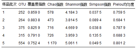 通過對(duì)5個(gè)批次樣品16S rRNA基因文庫進(jìn)行焦磷酸測(cè)序,經(jīng)修剪去雜后,共獲得1 128、 1 299、 1 292、 1 019和1 462條優(yōu)化序列,序列平均長度為545 bp. 將優(yōu)化序列截齊后與SILVA比對(duì)后進(jìn)行聚類,在97%相似性下分別獲得252、 264、 375、 315和554 OTUs,稀疏曲線如圖 1所示. 從中可知,當(dāng)測(cè)序數(shù)量超過1 000時(shí),仍有新的OUT可被測(cè)出. 稀疏曲線隨測(cè)序序列增加趨向平坦,表明本研究樣本取樣量合理. 表 3列出了α多樣性分析各樣品的多樣性指數(shù).