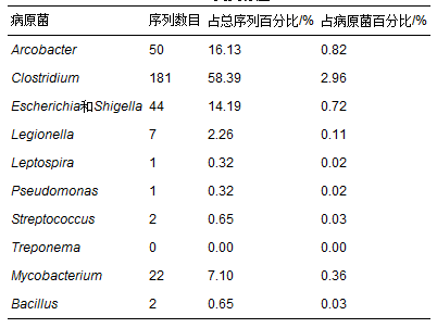 (1)454焦磷酸測(cè)序研究污水廠二級(jí)出水中微生物群落結(jié)構(gòu),共發(fā)現(xiàn)12個(gè)門的細(xì)菌,其中擬桿菌門和變形菌門是主要的門類,且擬桿菌門的主要組成部位為Flavobacteria,變形菌門的主要組成部位為α-、 β-和γ-Proteobacteria. 本研究共發(fā)現(xiàn)11種病原菌,其中梭菌屬和分支桿菌是主要的屬類,此外還有軍團(tuán)菌等常見的致病性較高的病原菌.
