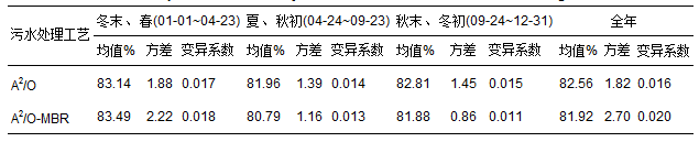 通過SPSS 18.0對(duì)數(shù)據(jù)進(jìn)行描述性統(tǒng)計(jì)分析,計(jì)算得到不同季節(jié)和全年脫水污泥含水率的方差和變異系數(shù),可以定量地描述不同污水處理工藝不同季節(jié)污泥脫水效果的波動(dòng)情況(表 1). A2/O-MBR工藝的污泥脫水效果在不同季節(jié)間波動(dòng)較為明顯. 兩種污水處理工藝的污泥都在夏季更容易脫水,脫水污泥含水率基本接近80%,而冬季、 初春時(shí)節(jié),脫水污泥的含水率明顯增高,達(dá)到(83.49±1.49)%. 這說明不同污水處理工藝污泥脫水性能都受到季節(jié)性影響更為顯著. 生物處理過程產(chǎn)生的污泥脫水性能受季節(jié)性變化影響,已有相關(guān)的研究報(bào)道. Wang等[7]通過實(shí)驗(yàn)研究發(fā)現(xiàn),溫度季節(jié)變化對(duì)MBR污泥脫水性能的影響顯著,低溫下污泥CST的增大表明其脫水性能的嚴(yán)重惡化. 此外,Al-Halbouni等[8]對(duì)德國(guó)一座處理能力為80000人口當(dāng)量的污水處理廠調(diào)查也得到類似結(jié)果,冬季污水處理廠污泥過濾性能較夏季更差.