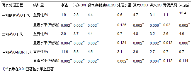 表 4為RDA分析的進(jìn)水水質(zhì)以及工藝運(yùn)行條件等變量共同進(jìn)行污泥泥質(zhì)、 脫水性能解釋時(shí)各自的重要性和顯著性結(jié)果(499次變換的Monte Carlo 檢驗(yàn)). 顯著性檢驗(yàn)表明各解釋變量是否對(duì)污泥泥質(zhì)、 脫水性能產(chǎn)生密切相關(guān),重要性檢驗(yàn)體現(xiàn)該變量對(duì)污泥泥質(zhì)、 脫水性能影響大小. RDA分析結(jié)果表明,水溫、 污泥SVI、 曝氣池/膜池MLSS、 進(jìn)水COD、 進(jìn)水SS在不同污水處理工藝中都具有99%置信度,對(duì)污泥泥質(zhì)、 脫水性能密切相關(guān); 污泥齡只在A2/O工藝中具有顯著性,而處理水量只在A2/O-MBR工藝中顯著相關(guān); 污泥負(fù)荷在所有工藝中都不具有顯著性. 就重要性而言,A2/O工藝中水溫、 處理水量、 污泥負(fù)荷的重要性較低,而A2/O-MBR工藝中污泥負(fù)荷、 污泥齡重要性較低.
