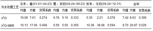 如表 2所示,全年A2/O工藝與A2/O-MBR工藝中污泥脫水絮凝劑的平均投配率(以DS計(jì),下 同)分別為(7.42±2.96) kg ·t-1和(8.70±7.25) kg ·t-1. A2/O工藝脫水污泥絮凝劑的投配率波動(dòng)相對(duì)較小,而A2/O-MBR工藝脫水污泥絮凝劑的投配率波動(dòng)大,特別在冬季,絮凝劑的投配率不但高,波動(dòng)也更為明顯,在10~12月末,絮凝劑投配率的方差和變異系數(shù)分別達(dá)到38.08、 0.594. 根據(jù)水廠2013年運(yùn)營(yíng)報(bào)告,MBR脫水機(jī)泥餅產(chǎn)量波動(dòng)很大,其中,在11月底進(jìn)行了配電室停電清掃,脫水機(jī)停機(jī),使得近幾天的產(chǎn)泥量較低. 此外,8、 9、 10、 12月中下旬出現(xiàn)幾次泥餅產(chǎn)量驟增的情況,固體負(fù)荷是影響污泥離心脫水機(jī)運(yùn)行狀態(tài)的重要參數(shù). 因此,這可能是導(dǎo)致MBR脫水機(jī)藥劑量在秋末冬初波動(dòng)大的原因. 在數(shù)據(jù)較為穩(wěn)定的夏季和秋初,兩種工藝下污泥脫水絮凝劑消耗差別不大. 但是,孫寶盛等[9]在實(shí)驗(yàn)室對(duì)比研究了MBR工藝和傳統(tǒng)活性污泥法污泥過濾阻力差異,結(jié)果表明,MBR工藝污泥混合液的過濾阻力達(dá)到了傳統(tǒng)活性污泥法過濾阻力的2~3倍.