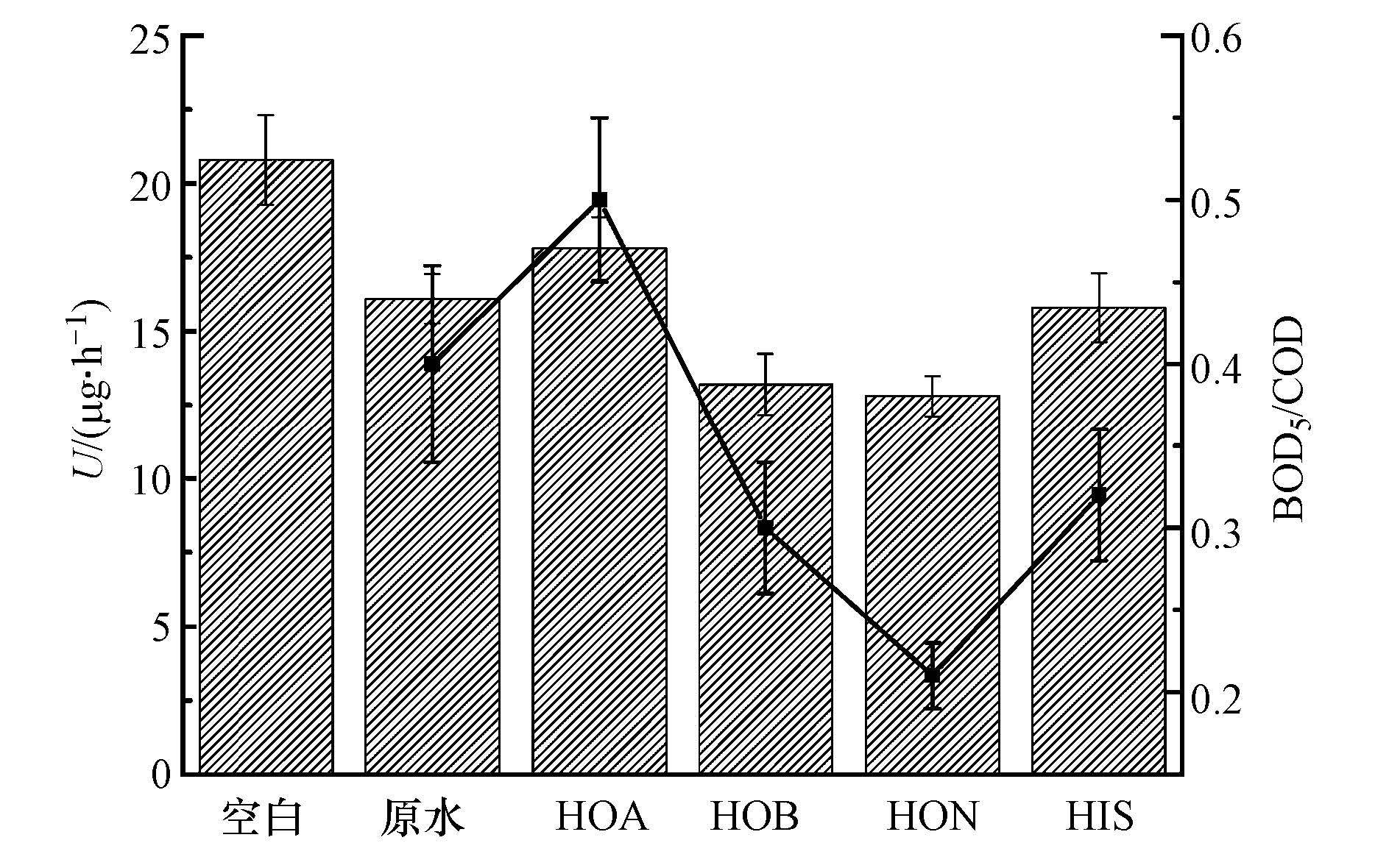 對比可知,廢水經過水解酸化之后具有較高的毒性,說明水解酸化環境不適合發光細菌生存.A2/O處理之后,有毒物質基本被去除殆盡,因此出水基本沒有毒性,而投加活性炭的A2/O(PACT),其出水毒性更低,同時TOC和B/C也更低,從另外一個角度證明了A2/O(PACT)對生化降解的強化作用.