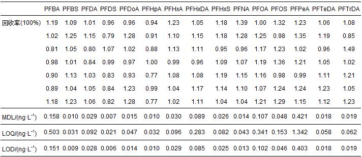 表 2 15種PFCs空白加標(biāo)回收率、MDL、LOQ及LOD