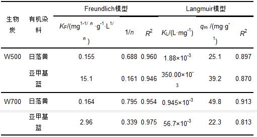 從表 3的R2可見,兩種生物炭對兩種染料的等溫吸附數據與Freundlich模型的擬合優度都高于Langmuir模型.說明生物炭對兩種染料的吸附都不局限于單層吸附,也不是單一的吸附機制(Alessandro,2001),且生物炭對亞甲基藍和日落黃的吸附機制也有所不同.