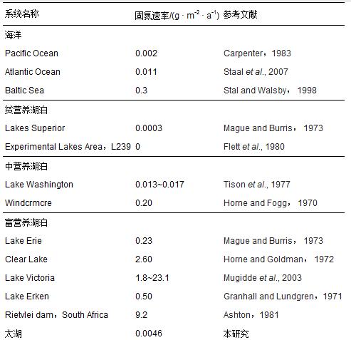 表2 太湖水體與其他水系統的固氮作用比較