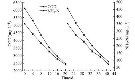 由于污泥生長極其困難,因此在運行期間都沒考慮排泥.此外,各試驗均采用COD和氨氮為考察指標,其COD采用快速消解分光光度法(HJ/T399-2007)測定;氨氮的濃度采用納氏試劑分光光度法測定.
