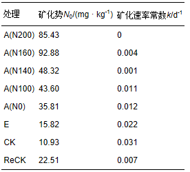氮素礦化速率常數(shù)的大小反映了土壤供氮的強(qiáng)度.從表 5看出,CK處理土壤氮素礦化速率常數(shù)最大,A(N200)、A(N160)、A(N140)相差不大;與對(duì)照ReCK相比,A(N100)、A(N0)、E處理提高了土壤供氮強(qiáng)度.微生物活動(dòng)和酶動(dòng)力學(xué)性質(zhì)決定著土壤中氮的礦化過(guò)程,因此,采用一級(jí)動(dòng)力學(xué)方程描述氮礦化過(guò)程是合理的.