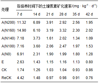 隨著培養(yǎng)時(shí)間的延長(zhǎng),各施氮處理土壤氮素礦化速率下降明顯(表 3).在培養(yǎng)期間,不同施氮處理的礦化速率大致可以劃分為3個(gè)階段:0~7 d為第一階段,各處理土壤的礦化速率為1.74~14.90 mg · kg-1 · d-1;7~21 d為第二階段,各處理的礦化速率迅速下降為0.97~3.91 mg · kg-1 · d-1;21~42 d為第三階段,各處理的礦化速率下降緩慢,基本趨于平穩(wěn),礦化速率為0.76~2.02 mg · kg-1 · d-1.A(N200)、A(N160)、A(N140)、A(N100)、A(N0)、E、 CK、ReCK各處理在培養(yǎng)期間的平均礦化速率分別為 4.92、5.31、2.83、3.13、2.70、1.38、1.14、1.59 mg · kg-1 · d-1,且ReCK處理的土壤平均礦化速率為CK處理的1.39倍.