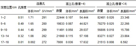 表3 巢湖W1點(diǎn)不同深度沉積物孔隙群統(tǒng)計(jì)表(3.375 mm3,250×250×250像素)