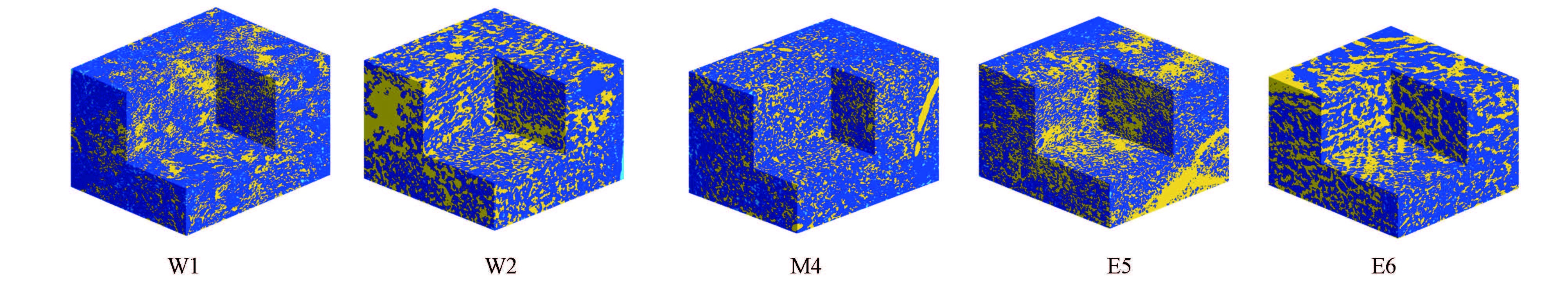 通過Mathematics軟件顯示沉積物各點(diǎn)三維孔隙結(jié)構(gòu),如圖 2所示,圖中深藍(lán)色部分為沉積物基質(zhì),黃色部分為連通孔,淺藍(lán)部分為孤立孔.