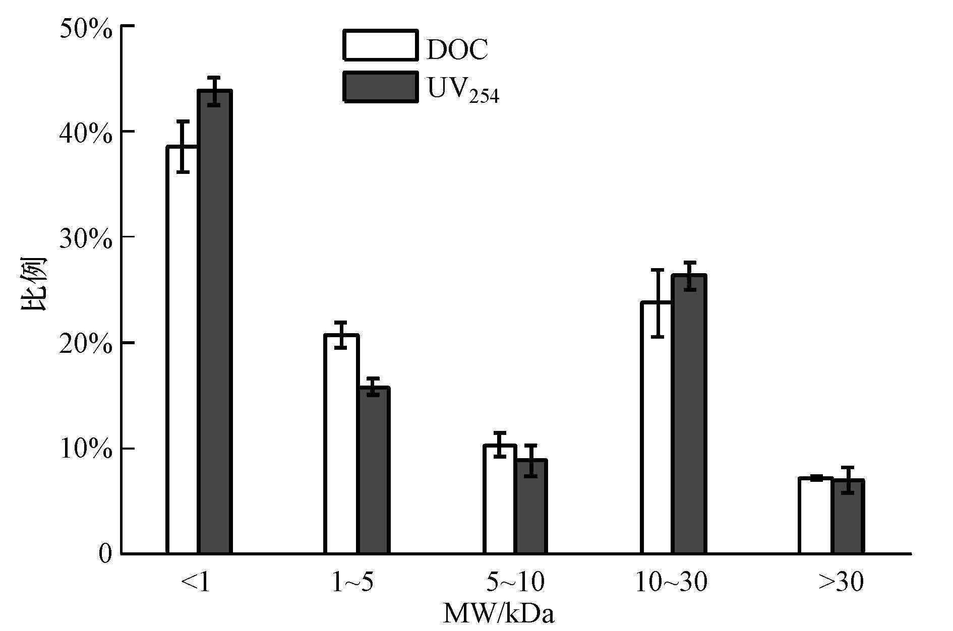 從圖 1可以看出,黃河原水的DOC含量根據分子量(MW)共分為5組(<1 kDa、1~5 kDa、5~10 kDa、10~30 kDa、>30 kDa),其占總量的百分比依次為38.39%、20.59%、10.23%、23.65%和7.14%,各分子量區間內UV254的分布規律與DOC相一致,比例分別為43.96%、15.52%、7.76%、25.01%和7.81%.其中,MW <1 kDa組分的比例最高,MW <5 kDa組分的DOC約占總量的60%.分析結果表明,黃河原水中DOM主要以小分子量存在形式為主.