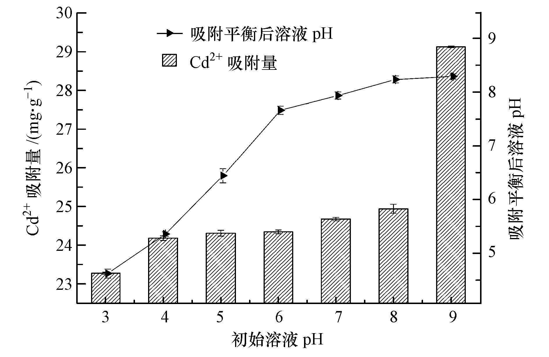 初始溶液pH對FARs吸附Cd2+的影響見圖 4.由圖 4可見,隨著溶液pH的增大,FARs對Cd2+的吸附量緩慢升高.因此,pH升高有助于FARs對Cd2+的吸附作用.其中,當初始溶液pH由3升高到8時,FARs對Cd2+的吸附量緩慢增加.但當pH為9時,對Cd2+的去除率可以達到97%.這是因為在pH較低時,H+與Cd2+不僅存在著競爭吸附,而且隨著溶液中H+與FARs中的其他陽離子進行交換,使吸附平衡后溶液的pH增加,FARs表面質子化,不利于Cd2+的吸附,因此,FARs對Cd2+的吸附量很低.隨著溶液的pH的增大,離子的競爭作用減小,所以FARs對Cd2+的吸附量逐漸增加.當溶液的pH升高到9時,溶液中的Cd2+部分形成難溶氫氧化物,此時,再加入FARs不僅起到交換吸附作用,還促進了沉淀物的沉降,并在沉降中還可能發生共沉淀作用,所以導致去除率比較大.因此,在酸性及中性范圍內離子交換和吸附起主導作用,而在pH為9時化學沉淀起主要作用.