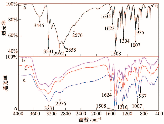 圖6 EDTC與3種螯合沉淀物的紅外光譜圖(4000~400 cm-1)(a. EDTC固體,b.EDTC和EDTA-Cu的反應沉淀物,c.EDTC和TA-Cu反應沉淀物,d:EDTC和CA-Cu反應沉淀物)
