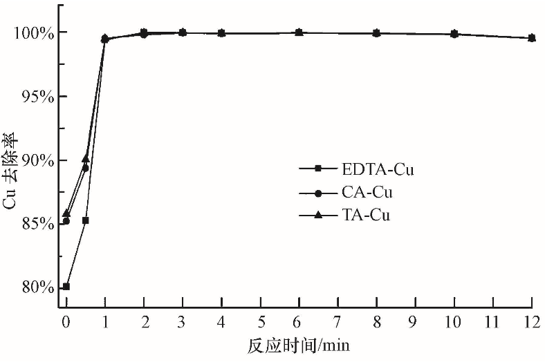 取濃度50 mg · L-1的各絡合銅廢水100 mL,調節pH=5.0,mEDTC/mCu=8,絮凝劑PAM為1 mg · L-1,調整慢攪時間0~12 min,考察反應時間對Cu去除效果的影響,結果如圖 5所示.可以看出,在前30 s,EDTC對絡合Cu的去除率僅為80%~90%,分析原因可能是由于EDTC與絡合離子對Cu2+的螯合競爭作用所致.在反應前3 min內,Cu的去除率隨著反應時間的延長而增加,在3 min后,EDTC與絡合銅的反應基本結束,Cu的去除率穩定在99.9%以上,出水濃度<0.15 mg · L-1,遠低于國家排放標準.當反應時間超過10 min后,Cu的去除率略有降低,但仍在99.5%以上.分析認為:反應結束后,繼續延長攪拌時間會導致絮體顆粒破碎,不能完全沉降,影響出水水質.總體來說,反應時間對Cu的去除效果影響沒有EDTC投加量和初始pH值大,考慮到反應時長關系到應用實際工程的反應池容積的大小,涉及經濟成本,故選擇反應時間為3 min.