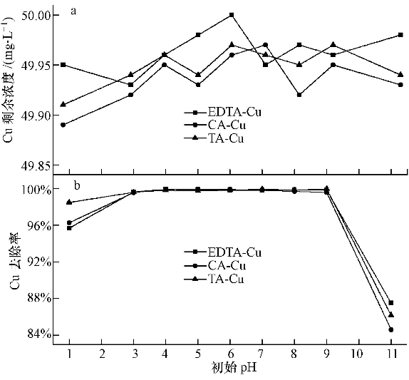 圖4 廢水初始pH對絡合Cu2+去除的影響(a.mEDTC/mCu=0,b.mEDTC/mCu=8)