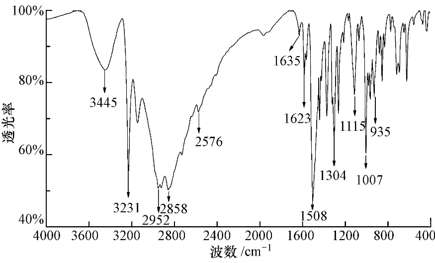 在400~4000 cm-1范圍內對EDTC進行紅外光譜測定,結果如圖 2所示.在3445 cm-1有—OH的伸縮振動峰,說明EDTC分子中含有結晶水;3213 cm-1處的吸收峰為N—H的伸縮振動峰;2952 cm-1處為C—H伸縮振動,且低于3000 cm-1,該峰為 C—H的飽和吸收峰;2858 cm-1處為—CH2的對稱伸縮振動峰;2576 cm-1處為—SH的伸縮振動峰;1635 cm-1處為 N—H 的變形振動峰;1508 cm-1處為 N—CS2的伸縮振動吸收峰,此峰介于C—N單建(1300 cm-1)和C=N雙鍵(1600 cm-1)之間,具有部分雙鍵性質;在1480~1510 cm-1處的ν(C—N)伸縮振動及在940~990 cm-1處的ν(C—S)伸縮振動表明二硫代甲酸鹽是雙齒配體;C—S的紅外特征吸收在1007 cm-1,低于C=S雙鍵的特征吸收(1501~1200 cm-1),而且是一個強吸收峰.以上結果可以說明EDTC分子類含有二硫代氨基甲酸基團.