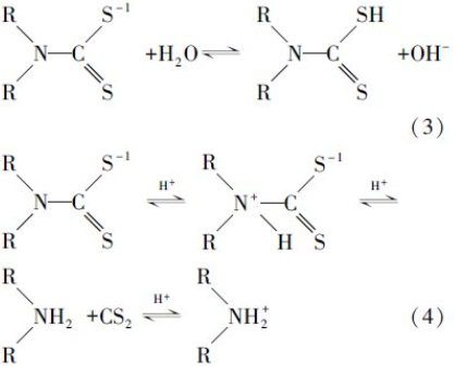 由圖 4a可知,3種絡合銅廢水中不添加EDTC時,pH值即使達到11,去除率接近為0,沒有Cu(OH)2沉淀產生,這說明EDTA-Cu、CA-Cu、TA-Cu很穩定,銅離子不能直接以氫氧化物的形式去除,即堿中和沉淀不能處理絡合銅廢水,需先進行破絡才能進一步處理.加入EDTC后,在pH值范圍為3~9內,Cu的去除率穩定在99.5%以上,殘余Cu濃度均達到排放標準;而當初始pH>11時,Cu的去除率下降至90%以下,反應前后溶液pH基本不變.分析原因:EDTC在水中存在式(3)電離平衡,隨著體系pH上升,平衡向生成DTC移動,會離解出更多的DTC基團與Cu2+螯合,且形成的絮體還能吸附溶液中一部分重金屬離子,致使去除率上升;但在強堿條件下(pH>11),絡合離子如EDTA、檸檬酸等與Cu2+形成的配合物穩定性較強,抑制了EDTC對Cu的捕集效果.以EDTA為例,在水溶液中,EDTA以H6Y2+、H5Y+、H4Y、H3Y-、H2Y2-、HY3-、Y4-這7種形式存在,在不同的pH條件下,各種形式的濃度是不同的.在pH>10.26的堿性溶液中,主要以Y4-形式為主,Y4-能與Cu2+直接配位,隨著pH的增加,Y4-的離子濃度就越大,EDTA對Cu2+的配位能力越強.因此,在強堿條件下,Cu的去除率有所下降.在強酸條件下,一方面式(3)電離平衡右移,DTC基團減少,EDTC對Cu2+的去除效果下降,同時EDTC還可能會按式(4)分解為CS2和質子化的胺,這樣會消耗一部分EDTC,Cu的去除率隨之降低.另一方面H+濃度較高,可能會與Cu2+競爭重金屬捕集劑表面的螯合活性位點.這與劉新梅等用捕集劑DTC(BETA)對含銅廢水進行螯合處理,Cu的去除最佳pH范圍在3~9之間的研究結果是一致的.