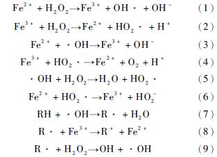目前,國內(nèi)外學(xué)者對含火炸藥廢水 的主要處理手段是吸附法[4]?萃取法[5]?高級氧化法[6]?電化學(xué)法[7]?厭氧-好氧生物法[8]?植物法[9]等。其中吸附法?萃取法是物理處理技術(shù),操作簡單,反應(yīng)快,但材料成本高且有二次污染[10];高級氧化法和電化學(xué)法屬于化學(xué)處理技術(shù),反應(yīng)速率快,耐受污染濃度高,但能耗大,工業(yè)運(yùn)作成本高;厭氧-好氧生物法和植物法屬于生物處理技術(shù),易于操作和管理,建設(shè)費(fèi)和維護(hù)費(fèi)低,不引起二次污染,但由于火炸藥污染土壤淋洗液中有毒物質(zhì)較多,直接生化處理效果較差。Fenton氧化法是一種化學(xué)處理技術(shù),具有設(shè)備簡單,操作方便,反應(yīng)徹底并且不產(chǎn)生二次污染等優(yōu)點(diǎn)[11],可將底物礦化為二氧化碳和水或其他低毒物質(zhì)[12],具有廣泛的應(yīng)用前景。Fenton氧化法在水處理中的作用主要包括氧化和混凝兩種作用。氧化作用是指在酸性條件下Fe2+與H2O2 作用,生成具有強(qiáng)氧化能力的羥基自由基· OH 與有機(jī)物發(fā)生反應(yīng),羥基自由基的氧化還原電位為2.8V,僅次于氟(2.87V),達(dá)到氧化分解水中有機(jī)物的目的,反應(yīng)方程見(1)~(9)式;反應(yīng)中生成的Fe(OH)3 膠體具有絮凝?吸附功能,可去除水中部分有機(jī)物[13]。Chen等采用Fenton氧化法處理炸藥廢水,發(fā)現(xiàn)Fen-ton試劑對DNT和TNT的降解效果優(yōu)于UV/H2O[14]2 。目前尚未見有采用Fenton氧化法處理火炸藥污染土壤淋洗液的報道。