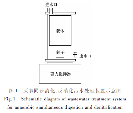 ??? 1.2 實驗裝置及運行方式以內徑6cm?長10cm的圓柱形有機玻璃為反應器,2端采用螺母加蓋固定,一端分別固定50mm×80mm網格間距為180μm的不銹鋼網和塑料網。各接種20mL馴化培養好的厭氧消化菌和反硝化菌懸浮液到反應器培養4d后,用培養液洗掉網面上附著不牢的污泥,每天更換一次待處理的模擬污水,下部用磁力攪拌器攪拌(100r/min)(見圖1)。