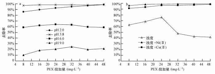 對PEX去除濁度的效能曾在兩種情況下做了對比:①以高嶺土配制濁度為90 NTU的水樣,調節pH值為不同值,投加不等量的PEX進行絮凝實驗;②以高嶺土配制濁度為90 NTU的水樣,加入一定量的重金屬離子Ni(Ⅱ)或Cu(Ⅱ),使其濃度分別為25 mg · L-1,不調節體系pH值(pH約為7.7),投加不等量的PEX進行絮凝實驗.實驗結果如圖 1所示.