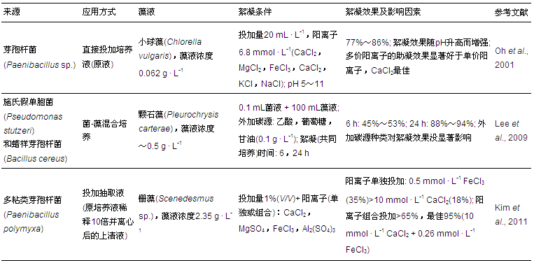 生物絮凝劑(Bioflocculant)是近幾年微藻絮凝的研究熱點之一. 生物絮凝劑一般是指微生物代謝活動中產生的具有絮凝效果的胞外聚合物(EPS). 細菌、真菌和放線菌都是能產生生物絮凝劑的常見微生物. 生物絮凝劑在微藻采收中的具體應用方式主要包括以下幾種:①投加絮凝微生物的混合培養液(微生物細胞+培養液);②菌-藻混合培養(需在微藻培養系統添加有機碳源);③絮凝微生物的胞外抽取液(離心后的上清液)作為絮凝劑;④分離純化后的胞外提取物作為絮凝劑;⑤直接投加絮凝微生物細胞作為絮凝劑.