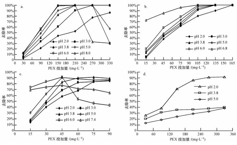 取僅含有一種類型重金屬且濃度均為25 mg · L-1的水樣,調節其pH為不同值后,投加不等量的PEX進行絮凝實驗,研究了在不同pH值下PEX去除多種單一重金屬的效果.代表性實驗結果舉例如圖 2所示.