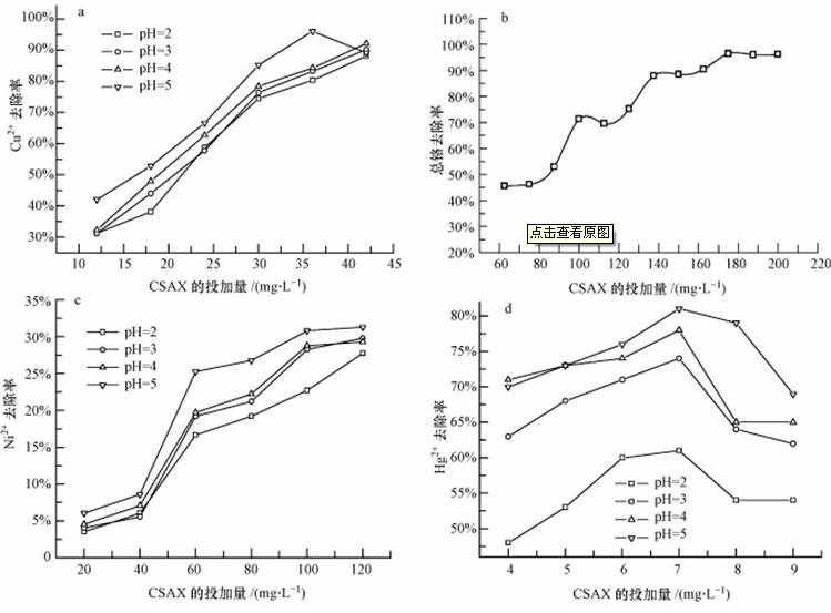 ·CSAX對水中重金屬離子Cu2+、Pb2+、和Cr(Ⅵ)有較高的去除率,但對Ni2+的去除效果不佳;