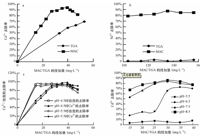 取濃度為25 mg · L-1的僅含銅或鎳水樣,將其pH值分別調整為5.3和7.8,分別投加不等量的MAC、TGA作絮凝實驗,對比它們去除重金屬離子的性能,結果如圖 8a、8b所示;取濃度為25 mg · L-1的含銅(并含濁)水樣或含鎘水樣,將其pH值分別調整為不同值,投加不等量的MAC,絮凝沉淀后,測定水中殘余重金屬的濃度,研究在不同pH值時MAC對重金屬的去除效率,實驗結果如圖 8c,8d所示.