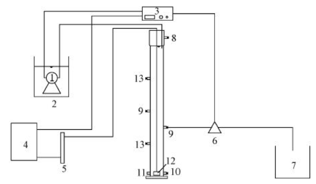 ?圖 1 SBR試驗(yàn)裝置(1.潛水泵,2.進(jìn)水箱,3.時(shí)間控制裝置,4.空壓機(jī),5.玻璃轉(zhuǎn)子流量計(jì),6.排水電磁閥,7.出水箱,8.溢流口,9.排出口,10.放空口,11.排泥口,12.微孔曝氣頭,13.取樣口)