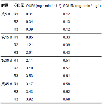 污泥好氧速率(OUR)與比好氧速率(SOUR)是評價(jià)污泥微生物代謝活性的重要指標(biāo),其變化可在一定程度上反映好氧污泥快速顆粒化過程中生物活性的變化(周曼等,2012).本試驗(yàn)選測在好氧污泥快速顆粒化進(jìn)程中,第5、15、30、45 d 3個(gè)反應(yīng)器內(nèi)污泥的OUR和SOUR值,結(jié)果見表 4.