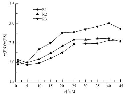 EPS中的PN/PS比與好氧顆粒污泥性質密切相關,其通過影響顆粒污泥細胞表面疏水性與表面電荷來調控微生物的聚集狀態(王浩宇等,2012).由于蛋白質中的氨基基團是EPS中的疏水組分,有利于污泥絮凝,而多糖中含有較高比例的親水基團(如羥基),是親水性的主要成分.適當的PN/PS對菌體細胞表面的親疏水性,進而對污泥的絮凝沉降性能十分重要.本試驗中m(PN)/m(PS)隨時間的變化曲線如圖 7所示.