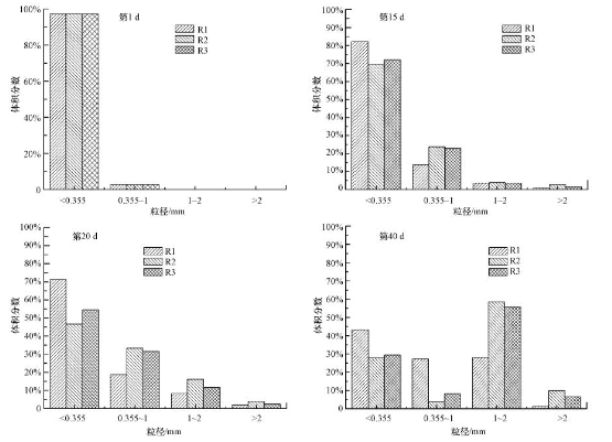 顆粒的粒徑對污泥的生物活性、傳質特性及沉降性能均具有顯著影響.常規的活性絮狀污泥粒徑一般介于20~200 μm,而顆粒污泥則具有較大的粒徑,能夠達到絮狀污泥的5~20倍,甚至更大.顆粒粒徑的變化可以直觀地體現污泥顆?;倪^程,本試驗分別于第1、15、20、40 d測定各反應器內粒徑分布以觀察其顆粒化進程(圖 3).
