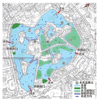 按照每月1次的采樣頻率,在湖面選擇10個監測點(圖 1)進行代表性污染物的連續監測,包括進水點1個(1#)、排水點2個(3#和5#)、湖心點3個(2#、4#和9#)、湖岸點2個(6#和7#)、水生植物區2個(8#和10#).由于翠湖屬于淺水湖泊,因此,每個采樣點均只采集水面(0 m)及水面下0.5 m處水樣,取二者平均值作為這一監測點的污染物濃度.
