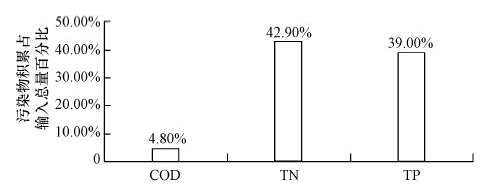 從表 2中污染物凈積累(NPA)的計算結果可以看出,COD在水體內的積累程度不嚴重,積累量為4027 kg · a-1,僅占COD輸入總量的4.8%;TN在水體內的積累程度最嚴重,積累量為8267 kg · a-1,占TN輸入總量的42.9%,與輸出總量基本相當;TP在水體內的積累程度也很嚴重,積累量為206 kg · a-1,占TP輸入總量的39.0%(圖 3).NPA的計算結果表明,翠湖水體中TN和TP的積累程度很高,這為水體中營養物的富集和藻類的過度繁殖提供了條件,對水體富營養化的控制非常不利.