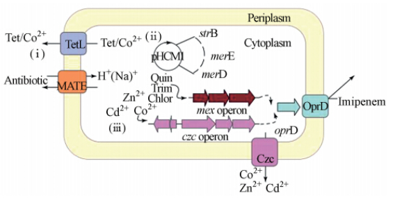 從抗生素抗性基因和重金屬抗性基因復合分布的微生物角度來看,主要存在以下4種機制(見圖 2):①交叉抗性.無論抗生素還是重金屬,任何一方的抗性增加均會導致另一方的抗性增加.如TetL蛋白不僅能夠向外排出四環素(Tet),而且能夠排出Co2+.②共抗性.當抗生素抗性基因和重金屬抗性基因處在同一段基因上時,那么一種抗性基因的增加就會導致另一種抗性基因的增加.如鏈霉素抗性基因(strB)和汞抗性基因(merE)共存于質粒pHCM1,因此任何一個基因的擴增均會伴隨著另外一個基因的同等擴增.③共調節抗性.各種調節系統在轉錄水平上是聯系在一起的,那么重金屬導致的抗性也會通過一種未知途徑增加抗生素的抗性.如mex操縱子和CZC操縱子共同調節亞胺培南(Imipenem)和Co、Zn、Cd的外排泵機制抗性(Perron et al., 2004).